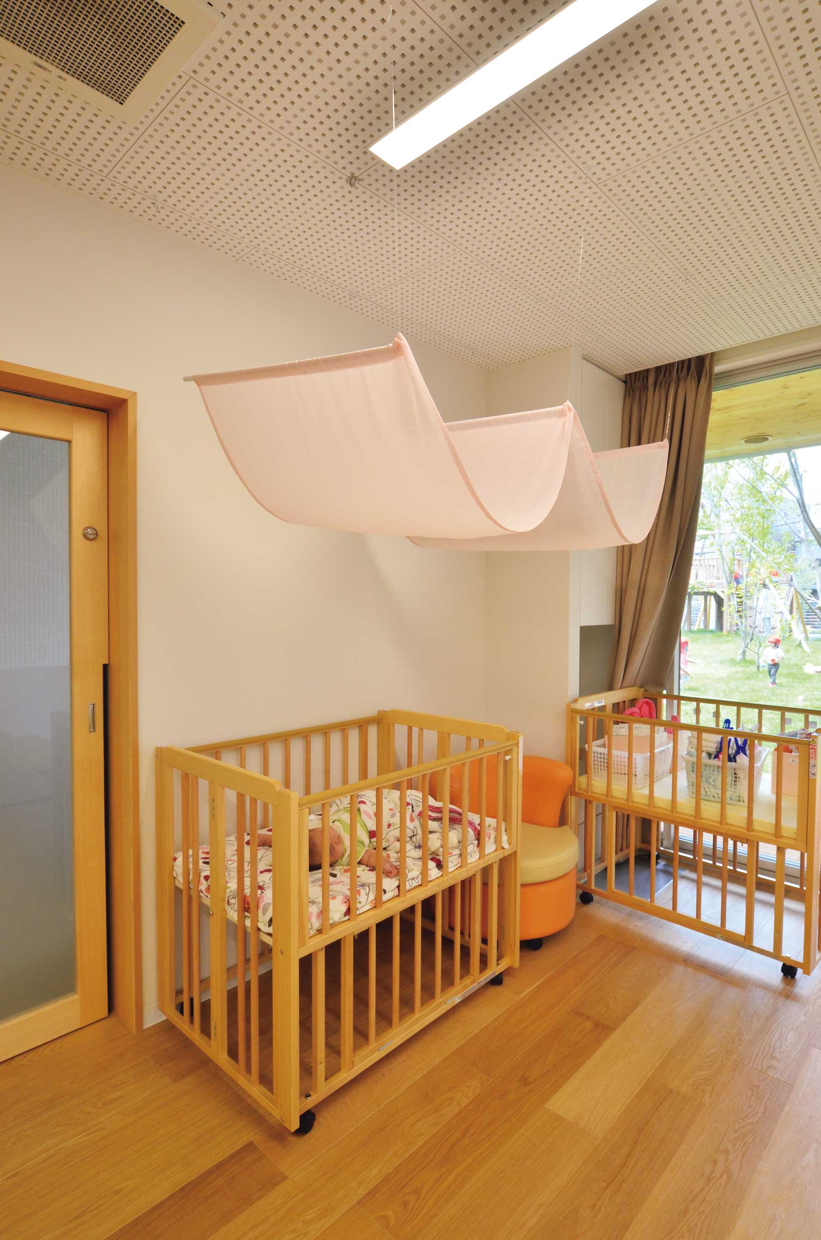ベビーベッドの場所には照明の光が直接当たらないように天蓋を付けました。