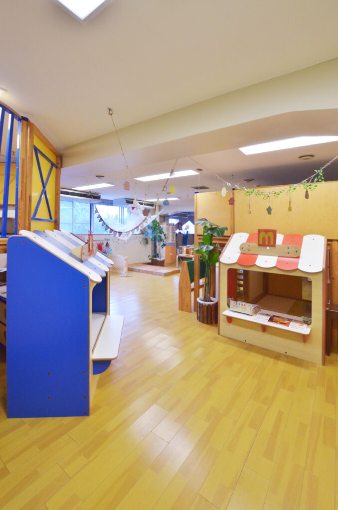 ままごとコーナーは、料理やお世話などの身近な体験を遊びの中で再現し、子ども同士のやりとりや関係を築くということでとても人気のあるコーナーです。空間のつくりは園によってさまざまです。