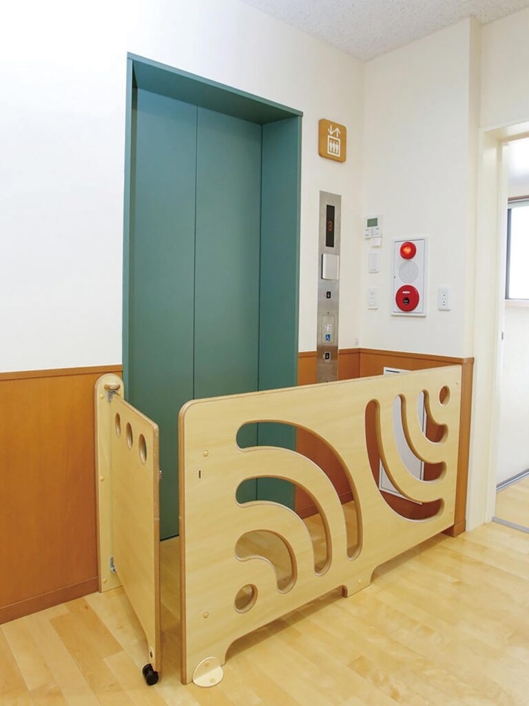 給食を運搬するワゴンと一緒にエレベーターに乗れるようにしたいというご要望に対して、あんぜんドアを設置した納入写真です。エレベーターに向かって正面ではない部分が開閉できるドアになっています。