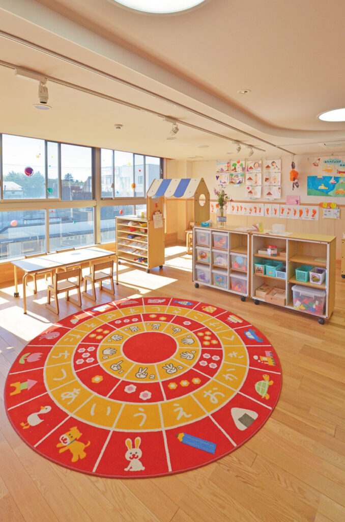 コーナーの前にラグなどを敷くとスペースの区ぎりになり、子どもからもコーナーの場所が分かりやすくなります。