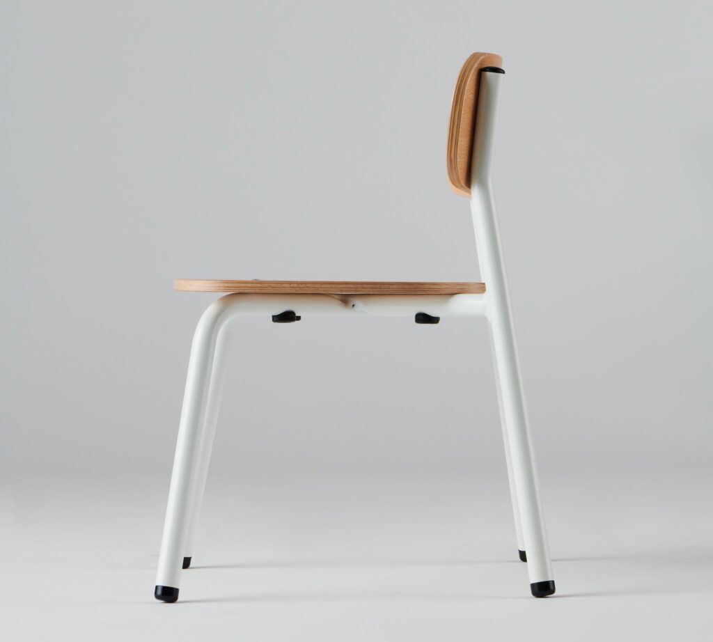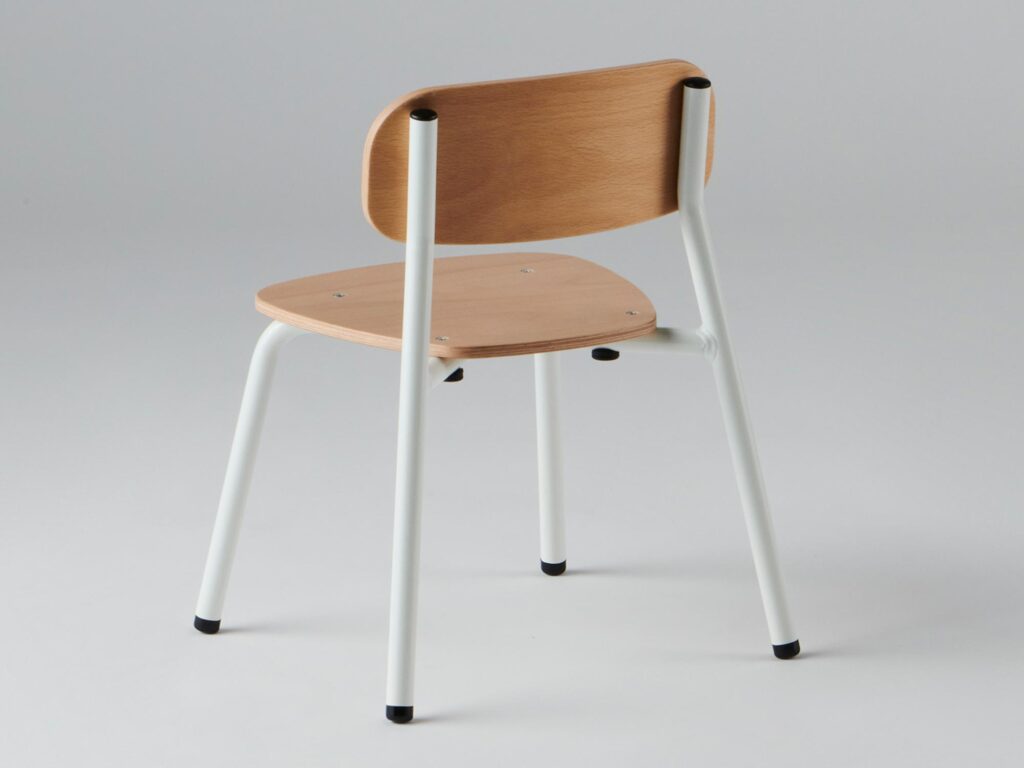 岐阜県の協力工場でていねいに作られているプリエチェア。壊れにくいパイプ脚、背もたれは体にフィットするよう曲面加工されています。2~5歳児向けに4サイズ用意しています。